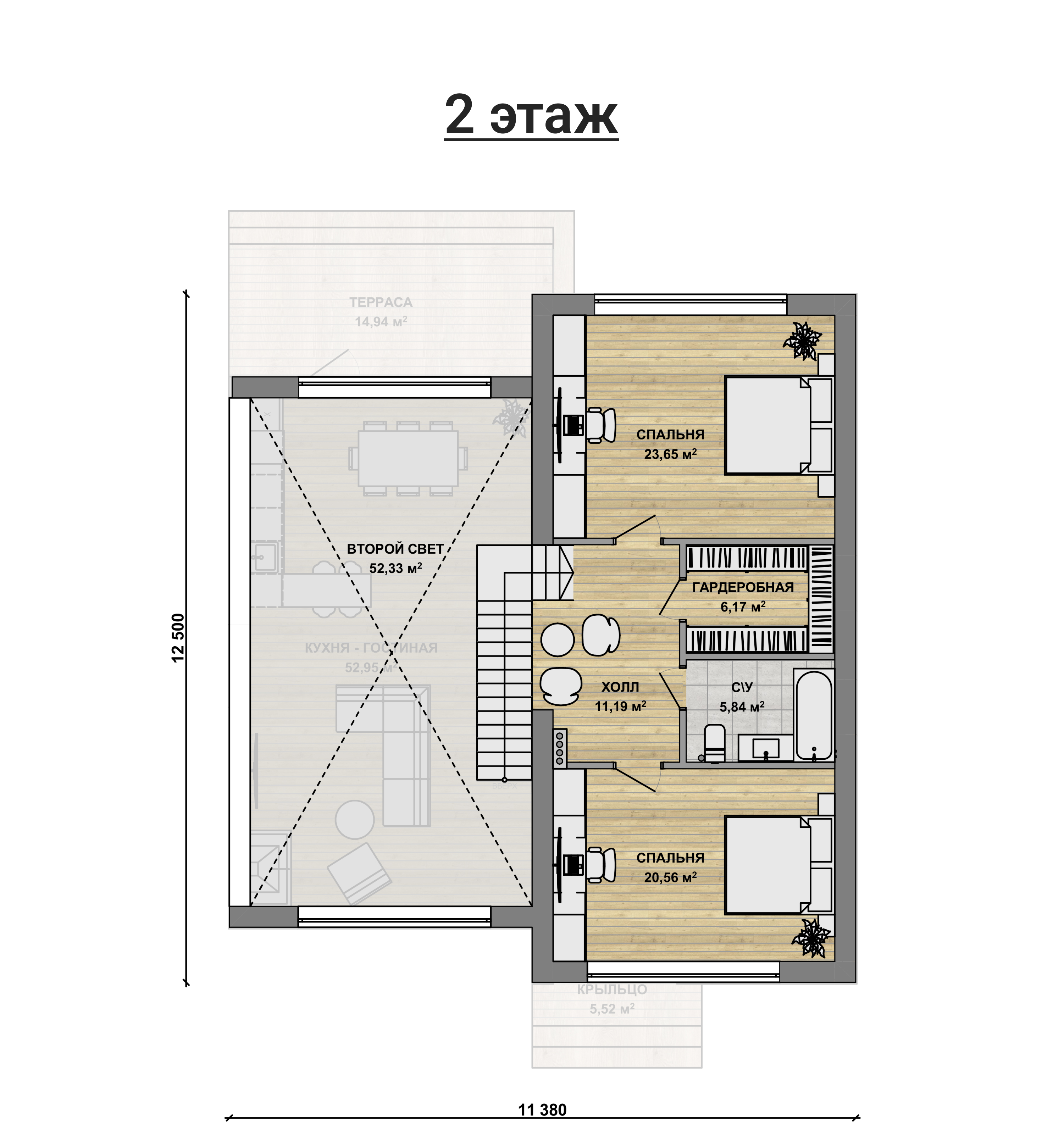 Площадь рассчитана по проектным осям. Реальная площадь может изменяться в зависимости от толщины наружных стен, а также особенностей внутренней планировки и отделки.