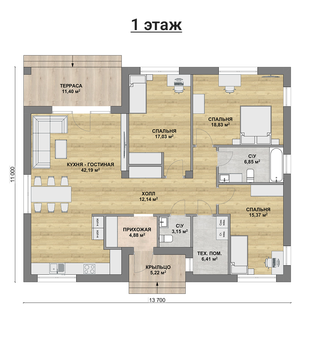Сердце дома — светлая кухня-гостиная площадью 37 м². Это больше, чем комната. Это сцена, где происходит настоящая жизнь: разговоры, смех, тихие вечера с книгой, семейные ужины и воскресные завтраки. Пространство легко трансформируется — от камерного до торжественного, подстраиваясь под настроение и поводы.